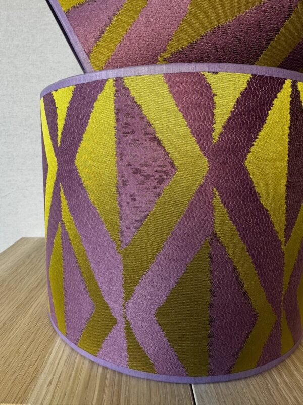 Deze kap heeft een diameter van 25cm en is 20cm hoog. Heeft een witte binnenkant en is afgewerkt met een paarse bies waardoor er een geheel ontstaat.