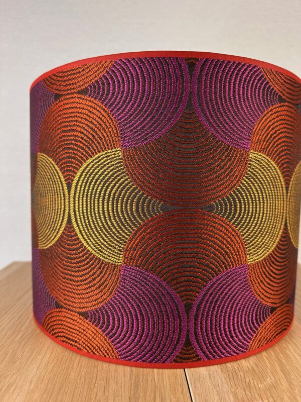 De kap op de foto heeft een doorsnede van 25cm en is 20cm hoog. De kap heeft een witte binnenkant en is afgewerkt met een “Dark Red” bies.